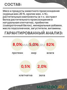 Мясо и продукты животного происхождения (курица мин.20 %, кролик мин. 4 %), растительные компоненты (в т.ч. экстракт белка растительного происхождения и натуральная клетчатка), пробиотик (сывороточный белок), минеральные добавки, масло подсолнечное, загустители, витамины.