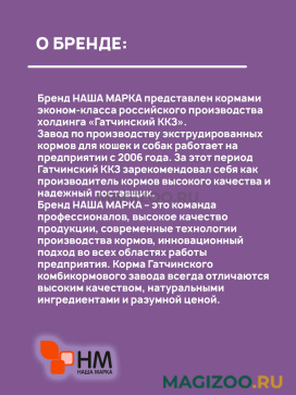 Бренд НАША МАРКА – это команда профессионалов, высокое качество продукции, современные технологии производства кормов, инновационный подход во всех областях работы предприятия. Корма Гатчинского комбикормового завода всегда отличаются высоким качеством, натуральными ингредиентами и разумной ценой.