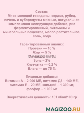 Мясо молодой говядины, сердце, рубец, печень и субпродукты мясные, натуральная комплексная желирующая добавка, рис ферментированный, витамины и минеральные вещества, масло растительное, соль, вода.