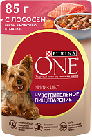Влажный корм PURINA ONE МИНИ ЧУВСТВИТЕЛЬНОЕ ПИЩЕВАРЕНИЕ для взрослых собак маленьких пород с лососем, рисом и морковью в подливе отличается от других кормов рецептурой, невысоким ценником и отличным составом. Кормом животное питается регулярно, никаких реакций плохих на заметила. Отличное самочувствие и настроение у животного.