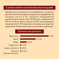 Моему питомцу нравится этот корм. Он в меру густой, добротные рыбные и овощные кусочки. Сочетание овощей и рыбы очень удачное : корм приятно пахнет. Удобно, что не нужно рассчитывать объем корма - пачка рассчитана на одну трапезу.