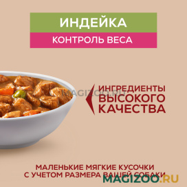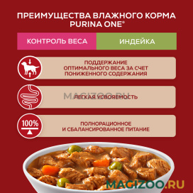 Влажный корм (консервы) PURINA ONE МИНИ КОНТРОЛЬ ВЕСА для взрослых собак маленьких пород с индейкой, морковью и горохом в подливе восполняет весь баланс необходимых для организма веществ. Прекрасный во всех планах: не вызывает проблем жкт, легко усваивается и привлекательный для животных. Псу нравится, возьму еще!