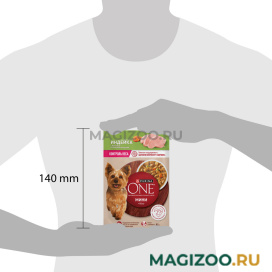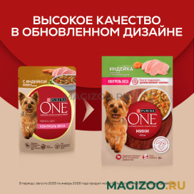 Влажный корм Purina ONE МИНИ для собак мелких и карликовых пород, с низкой физической активностью, склонных к набору веса или стерилизованных с индейкой, морковью и горохом в подливе.
