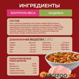 Серия "контроль веса" представлена сухим и влажным корм. Влажный выпускается с индейкой и курицей. Питомцу нравятся оба, поэтому их чередую. Сочный, в меру жидкий, с приятными на вид кусочками овощей и мяса располагает мою собаку к приятной трапезе.