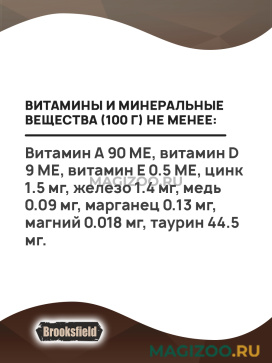 Информация о составе и ингредиентах, цветовом решении, технических и иных характеристиках, стране-изготовителе, внешнем виде и комплекте поставки товара носит справочный характер и основана на последних доступных к моменту публикации сведениях. Доставка данного товара осуществляется во все регионы РФ.BROOKSFIELD - сухой корм суперпремиум класса для собак и кошек. В нём воплотились последние достижения в технологии производства сухих кормов для домашних животных. Предприятие-изготовитель имеет возможность добавлять в рационы свежее мясо и другие натуральные ингредиенты, не прошедшие предварительную обработку, что обеспечивает составу каждой рецептуры особые преимущества.