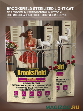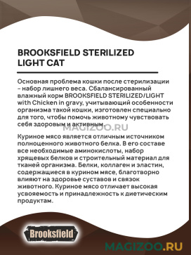 Основная проблема кошки после стерилизации – набор лишнего веса. Сбалансированный влажный корм BROOKSFIELD STERILIZED/LIGHT with Chicken in gravy, учитывающий особенности организма такой кошки, изготовлен специально для того, чтобы помочь животному чувствовать себя здоровым и активным.