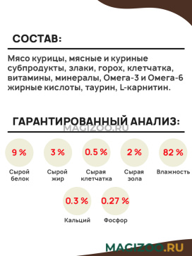 Мясо курицы, мясные и куриные субпродукты, злаки, горох, клетчатка, витамины, минералы, Омега-3 и Омега-6 жирные кислоты, таурин, L-карнитин.