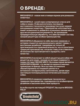 BROOKSFIELD включает в себя 6 рецептур для собак и 6 рецептур для кошек, каждая из которых содержит в своем составе СВЕЖЕЕ МЯСО. Все виды корма являются НИЗКОЗЕРНОВЫМИ, что является одним из важных преимуществ бренда. Все составы оптимально сбалансированы по пищевой ценности и витаминно-минеральному наполнению, делая корм настоящим полнорационным питанием для кошек и собак.