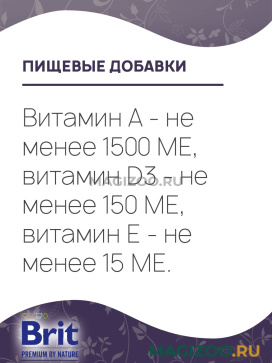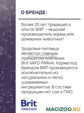 Информация о составе и ингредиентах, цветовом решении, технических и иных характеристиках, стране-изготовителе, внешнем виде и комплекте поставки товара носит справочный характер и основана на последних доступных к моменту публикации сведениях. Доставка данного товара осуществляется во все регионы РФ.Здоровье питомца является главным принципом компании Brit-VAFO PRAHA. Корма под брендом BRIT производятся исключительно из натуральных и легко усваиваемых ингредиентов. В составе продукции нет сои и ГМО.