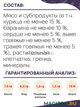 Мясо и субпродукты (в т.ч. курица не менее 15 %, баранина не менее 10 %, сердце не менее 5 %, вымя говяжье не менее 5 %, трахея говяжья не менее 5 %), растительная клетчатка, гречка, минералы.