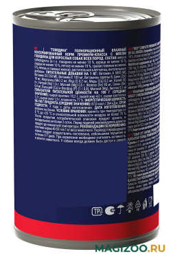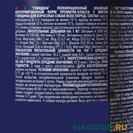 Полнорационный влажный консервированный корм премиум-класса с говядиной для взрослых собак всех пород.