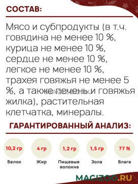 Мясо и субпродукты (в т.ч. говядина не менее 10 %, курица не менее 10 %, сердце не менее 10 %, легкое не менее 10 %, трахея говяжья не менее 5 %, а также печень и говяжья жилка), растительная клетчатка, минералы.