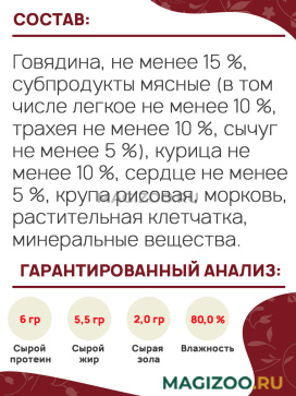 Говядина, не менее 15 %, субпродукты мясные (в том числе легкое не менее 10 %, трахея не менее 10 %, сычуг не менее 5 %), курица не менее 10 %, сердце не менее 5 %, крупа рисовая, морковь, растительная клетчатка, минеральные вещества.