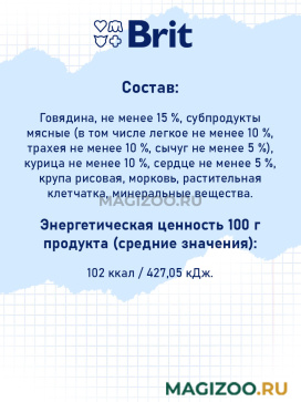 Информация о составе и ингредиентах, цветовом решении, технических и иных характеристиках, стране-изготовителе, внешнем виде и комплекте поставки товара носит справочный характер и основана на последних доступных к моменту публикации сведениях. Доставка данного товара осуществляется во все регионы РФ.Здоровье питомца является главным принципом компании Brit-VAFO PRAHA. Корма под брендом BRIT производятся исключительно из натуральных и легко усваиваемых ингредиентов. В составе продукции нет сои и ГМО.