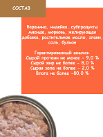 Индейка не менее 15 %, утка не менее 10 %, субпродукты мясные (в том числе легкое не менее 10 %, трахея не менее 10 %, кожа утиная не менее 10 %), курица не менее 10 %, сердце не менее 5 %, морковь, растительная клетчатка, минеральные вещества.