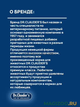 Бренд DR.CLAUDER’S был назван в честь специалиста по ветеринарному питанию, который основал одноименную компанию в 1957 году, и занимался разработкой пищевых добавок пригодных для животных в разные периоды жизни.