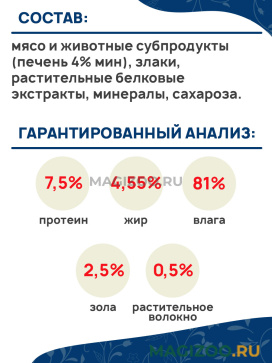 Состав: мясо и животные субпродукты (печень 4% мин), злаки, растительные белковые экстракты, минералы, сахароза.