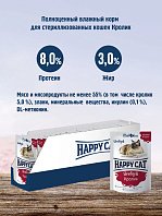 Полноценный корм Happy Cat Sterilised с кусочками кролика в соусе для кастрированных котов и стерилизованных кошек обеспечивает правильное и разнообразное питание Вашему питомцу.