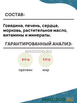 Говядина, печень, сердце, морковь, растительное масло, витамины и минералы.