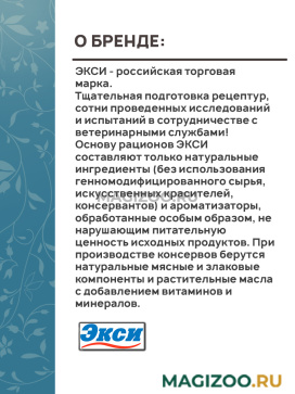 Технология изготовления консервов ЭКСИ позволяет сохранять стерильный корм в герметично закрытой упаковке несколько лет с неизмененными питательными и вкусовыми свойствами.