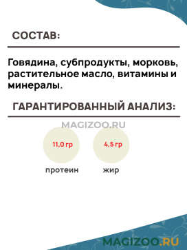 Говядина, субпродукты, морковь, растительное масло, витамины и минералы.