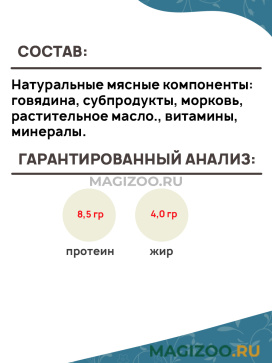 Натуральные мясные компоненты: говядина, субпродукты, морковь, растительное масло., витамины, минералы.