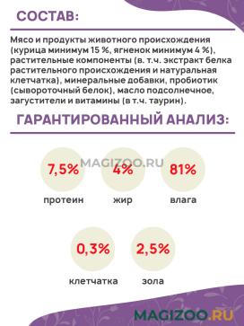 Мясо и продукты животного происхождения (курица минимум 15 %, ягненок минимум 4 %), растительные компоненты (в. т.ч. экстракт белка растительного происхождения и натуральная клетчатка), минеральные добавки, пробиотик (сывороточный белок), масло подсолнечное, загустители и витамины (в т.ч. таурин).