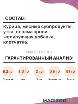 Курица, мясные субпродукты, утка, плазма крови, желирующая добавка, клетчатка.