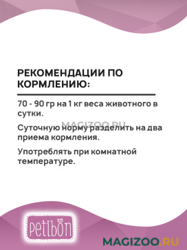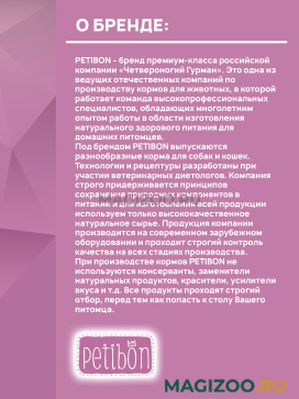 Информация о составе и ингредиентах, цветовом решении, технических и иных характеристиках, стране-изготовителе, внешнем виде и комплекте поставки товара носит справочный характер и основана на последних доступных к моменту публикации сведениях. Доставка данного товара осуществляется во все регионы РФ.Под брендом PETIBON выпускаются разнообразные корма для собак и кошек. Технологии и рецептуры разработаны при участии ветеринарных диетологов. Компания строго придерживается принципов сохранения природных компонентов в питании и для изготовления всей продукции используем только высококачественное натуральное сырье. Продукция компании производится на современном зарубежном оборудовании и проходит строгий контроль качества на всех стадиях производства.