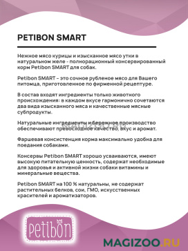 Консервы Petibon SMART хорошо усваиваются, имеют высокую питательную ценность, содержат необходимые для здоровья и активной жизни собаки витамины и минеральные вещества.