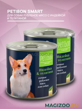 Сочетание сочной индейки и нежной телятины в натуральном желе - полнорационный консервированный корм Petibon SMART для собак.