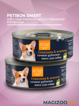 Сочная говядина и ароматное мясо ягненка в натуральном желе - полнорационный консервированный корм Petibon SMART для собак.