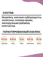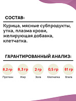 Курица, мясные субпродукты, утка, плазма крови, желирующая добавка, клетчатка.