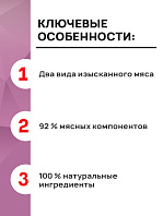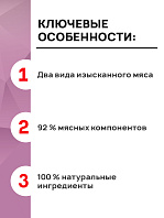 В состав входят ингредиенты только животного происхождения: в каждом вкусе гармонично сочетаются два вида изысканного мяса и качественные мясные субпродукты.
