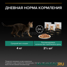 Для взрослой кошки среднего веса (4 кг) требуется 2,5 пакетика в день, разделенных минимум на два кормления. Индивидуальные потребности кошки могут варьироваться, и ежедневное количество корма должно быть скорректировано в соответствии с необходимостью поддержания оптимального веса кошки. Подавайте корм комнатной температуры. Следите, чтобы у вашей кошки всегда была чистая свежая питьевая вода.