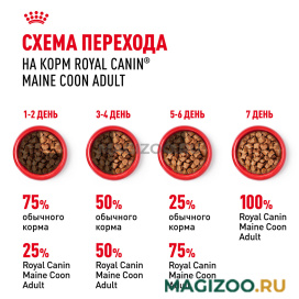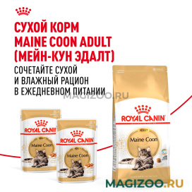 Для удовлетворения индивидуальных предпочтений каждого животного также предусмотрен сухой корм ROYAL CANIN® Maine Coon Adult с крупными крокетами кубической формы, специально адаптированными для челюстей мейн-куна.