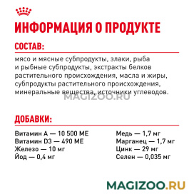 Информация о составе и ингредиентах, цветовом решении, технических и иных характеристиках, стране-изготовителе, внешнем виде и комплекте поставки товара носит справочный характер и основана на последних доступных к моменту публикации сведениях. Доставка данного товара осуществляется во все регионы РФ.Развитие ROYAL CANIN всегда обусловлено научными исследованиями. В ROYAL CANIN работает команда профессионалов – ветеринарных врачей и специалистов в области питания