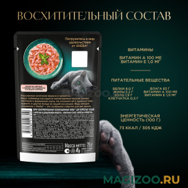 Ломтики с нежной форелью и ароматными креветками в фирменном соусе - блюдо из высококачественных ингредиентов, которое придётся по вкусу самым притязательным кошкам.