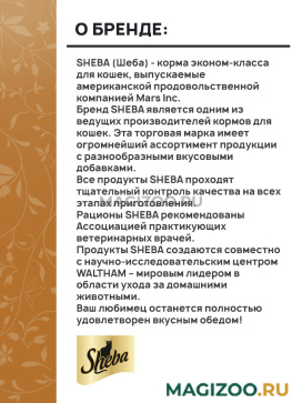 Бренд SHEBA является одним из ведущих производителей кормов для кошек. Эта торговая марка имеет огромнейший ассортимент продукции с разнообразными вкусовыми добавками.
