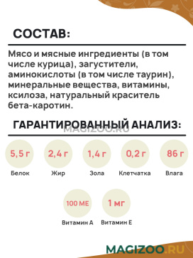 Мясо и мясные ингредиенты (в том числе курица), загустители, аминокислоты (в том числе таурин), минеральные вещества, витамины, ксилоза, натуральный краситель бета-каротин.