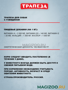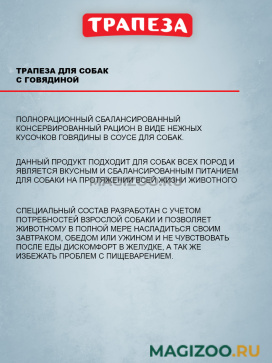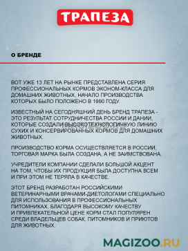 Информация о составе и ингредиентах, цветовом решении, технических и иных характеристиках, стране-изготовителе, внешнем виде и комплекте поставки товара носит справочный характер и основана на последних доступных к моменту публикации сведениях. Доставка данного товара осуществляется во все регионы РФ.Известный на сегодняшний день бренд ТРАПЕЗА - это результат сотрудничества России и Дании, которые создали высокотехнологичную линию сухих и консервированных кормов для домашних животных.