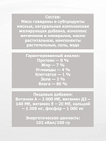 Мясо говядины и субпродукты мясные, натуральная комплексная желирующая добавка, комплекс витаминов и минералов, масло растительное, компоненты растительные, соль, вода.