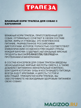 Влажный корм ТРАПЕЗА, приготовленный для собак, оптимально сочетает в своем составе белки, жиры и углеводы. Это комплексное питание, разработанное российскими диетологами, которое полностью соответствует климатическим особенностям нашей страны. Каждая баночка содержит натуральные мясные продукты высокого качества, обогащена протеинами и минералами.