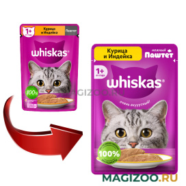 Полнорационный консервированный корм Whiskas для взрослых кошек – паштет с курицей и индейкой.