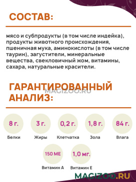 Состав: мясо и субпродукты (в том числе индейка), продукты животного происхождения, пшеничная мука, аминокислоты (в том числе таурин), загустители, минеральные вещества, свекловичный жом, витамины, сахара, натуральные красители.