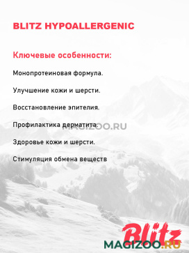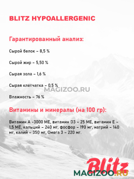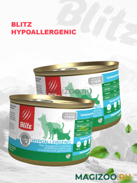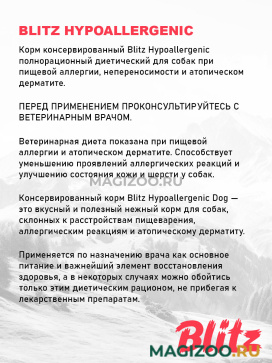 Консервы Blitz Hypoallergenic Dog — питательный, сочный и незаменимый рацион, созданный ветеринарными специалистами, чтобы легко накормить собаку и улучшить её состояние!