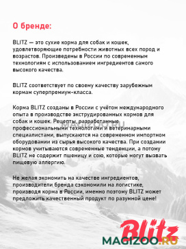 Не желая экономить на качестве ингредиентов, производители бренда сэкономили на логистике, производя корма в России, именно поэтому BLITZ может предложить качественный продукт по разумной цене!