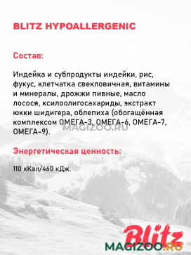 Корма BLITZ созданы в России с учётом международного опыта в производстве экструдированных кормов для собак и кошек. Рецепты, разработанные профессиональными технологами и ветеринарными специалистами, выпускаются на современном импортном оборудовании из сырья высокого качества. При создании кормов учитываются современные тенденции, а потому BLITZ не содержит пшеницу и сою, которые могут вызвать пищевую аллергию.