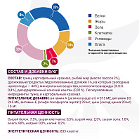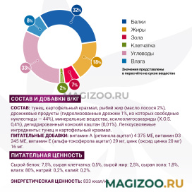 Состав: тунец (соответствует 100% использованного мяса), картофельный крахмал, рыбий жир (масло лосося 2%), дрожжевые продукты (гидролизованные дрожжи 1%, из которых свободные нуклеотиды 44%), минеральные вещества, ксилоолигосахариды (X.O.S. 0,4%), дегидрированный конский каштан (0,01%).