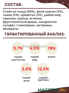 Стейк из тунца (60%), филе трески (5%), тыква (5%), креветки (5%), рыбий жир, свинина, курица, ягненок, фруктоолигосахариды, хондроитин сульфат, глюкозамин, витамины, минералы.